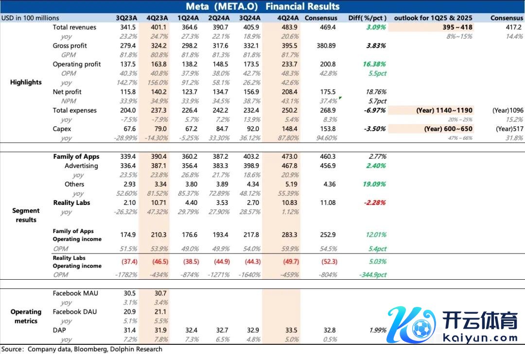 一方面,收入小超预期,主若是四季度渠说念调研中,告白主对Meta 投放一般,只可说基本inline的水平。而濒临医疗告白的投放监管压力,四季度Meta也在平台里面进行了诊治,因此医疗保健告白的领域比较去年要受到一些影响,况且会延续到2025年全年。